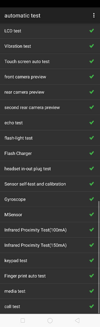 | 15 | M-Sensor Test | Shake the phone from the left to the right side. If the interface shows “PASS” and jumps to the next test, the function is good; |