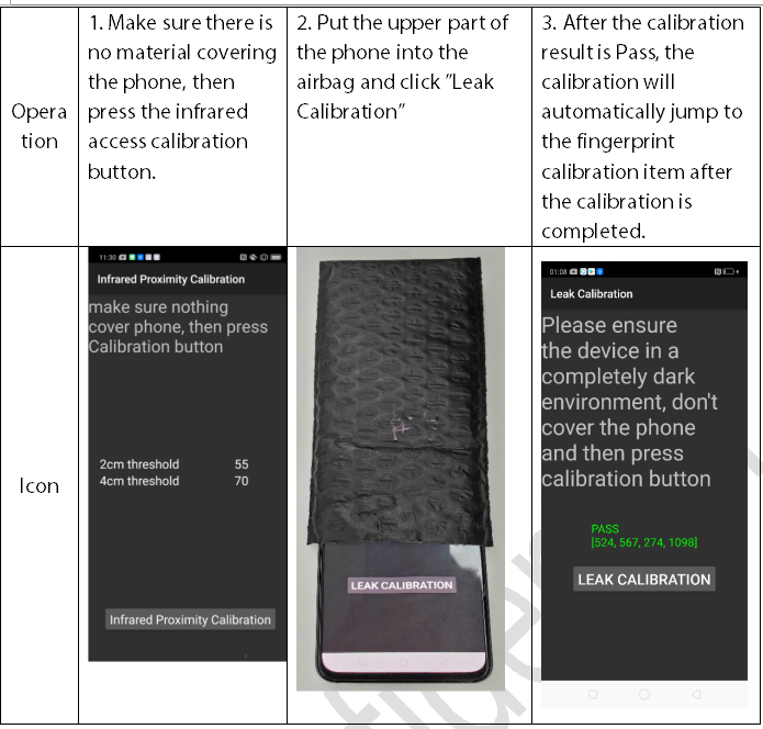 Calibration path: Enter *#899# in the dial interface>Aftersales Devices Calibration> Enter password “6776” >Infrared Proximity Calibration > Leak Calibration,Specific operations refer to calibration page hints:Put the upper part of the phone into the air bag to expose the “Light Leakage Calibration” button. After the upper part is blocked by the air bag, click “Light Leak Calibration” and the phone will automatically calibrate. After the calibration is completed, it will automatically jump to the next fingerprint calibration item.