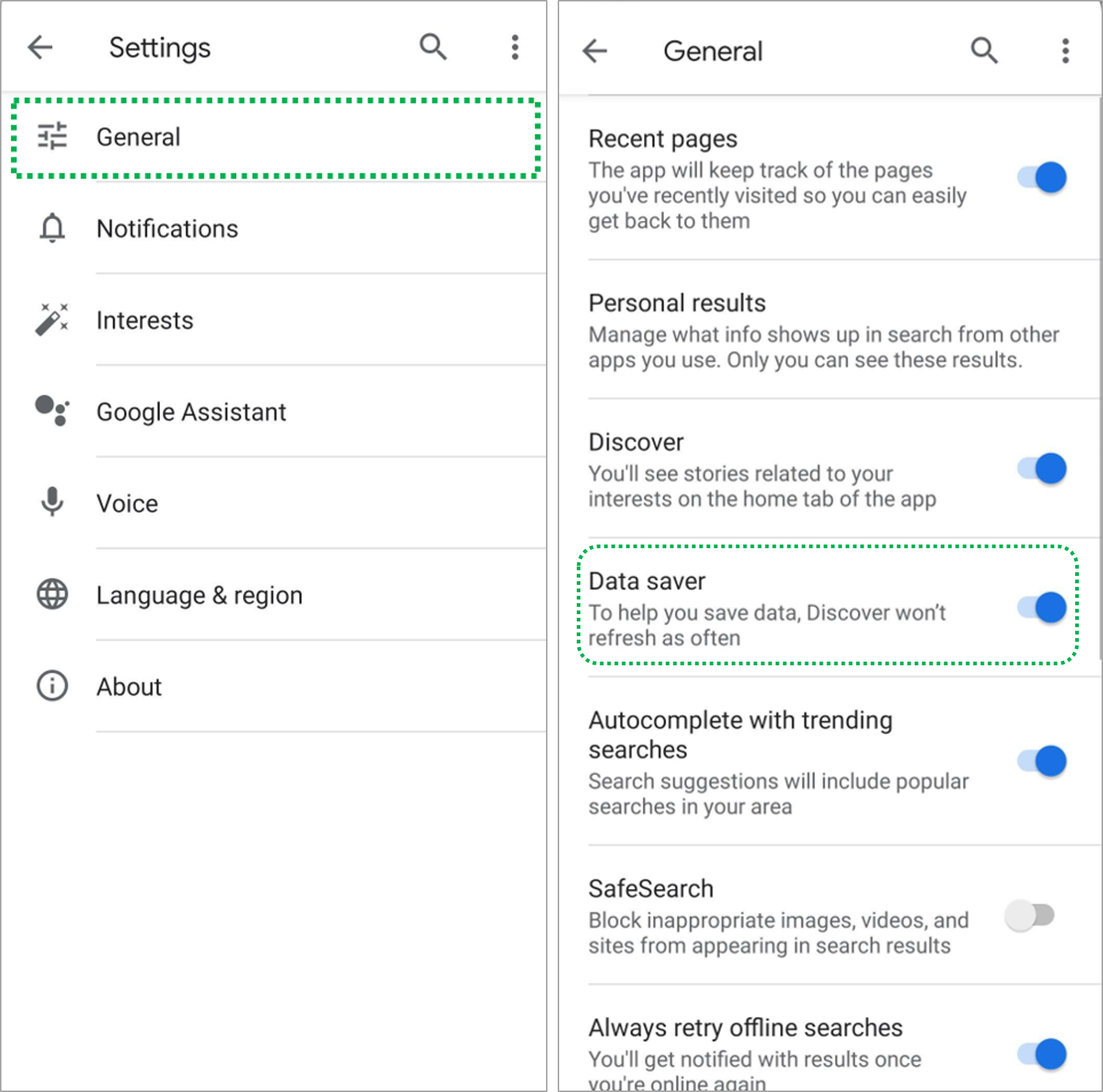 Open [Google] > [More] > [Settings] > [General] > Enable [Data Saver].