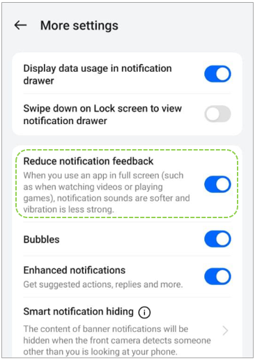 Open [Settings]> Click on [Notifications & Quick Settings] > Tap on [More settings] > Enable [Reduce notification feedback]