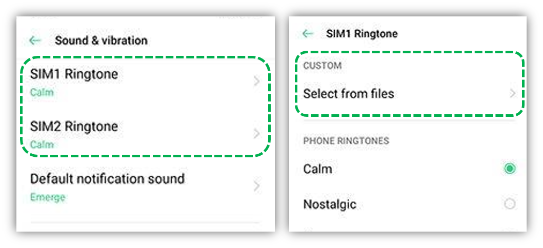 Go to [Settings] > [Sound & Vibration]> Select sim > [Select from files]