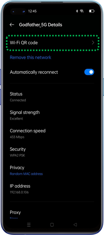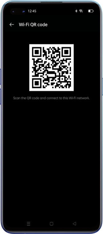 Go to [Settings] > [Wi-Fi] > Select the Connected Wi-Fi Network to which you want to share the connection > [Wi-Fi QR Code] > Verify by entering the lock screen passcode or fingerprint if any > you will be given a QR Code. Other devices can scan and connect to this Wi-FI network by scanning the code.