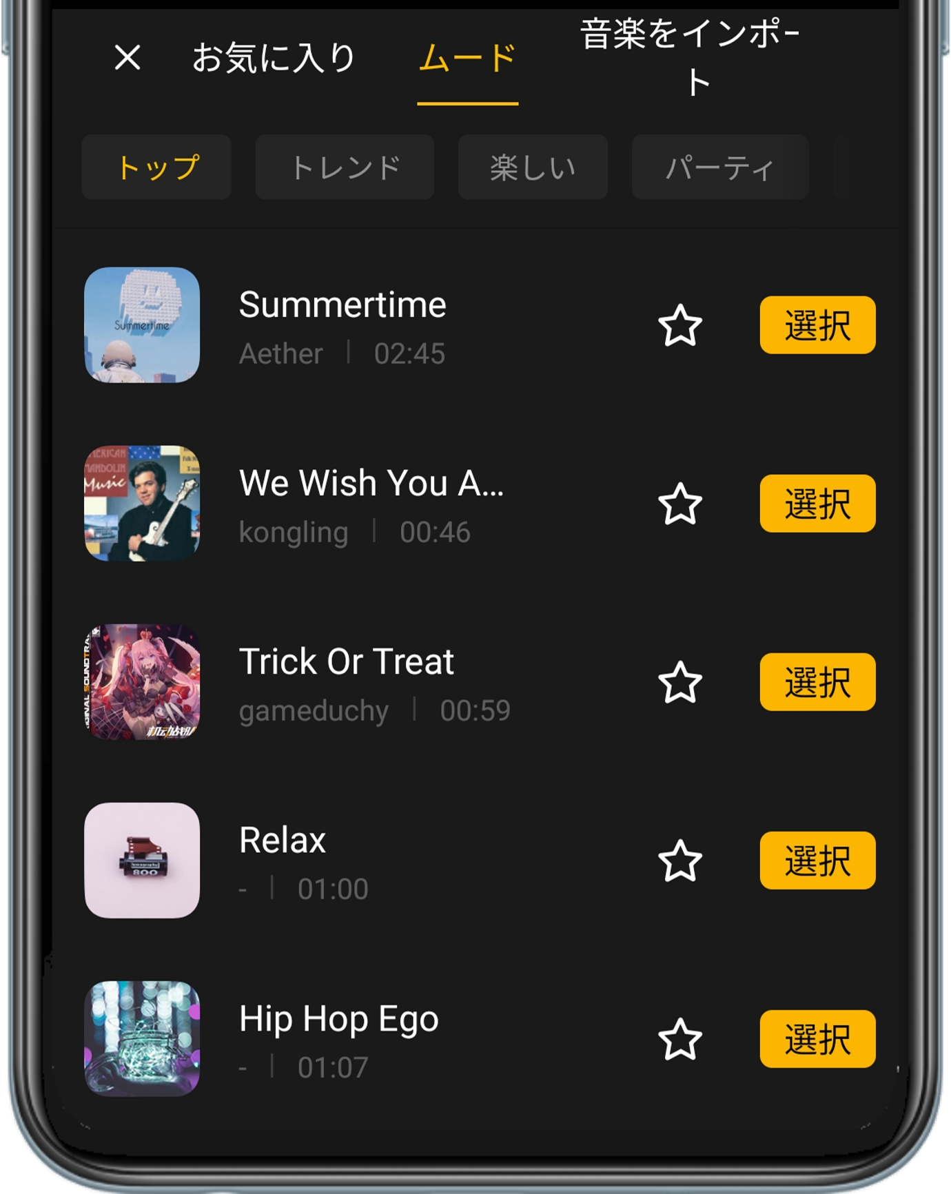 「ミュージック」をタップして、動画に適切なBGMを追加します。