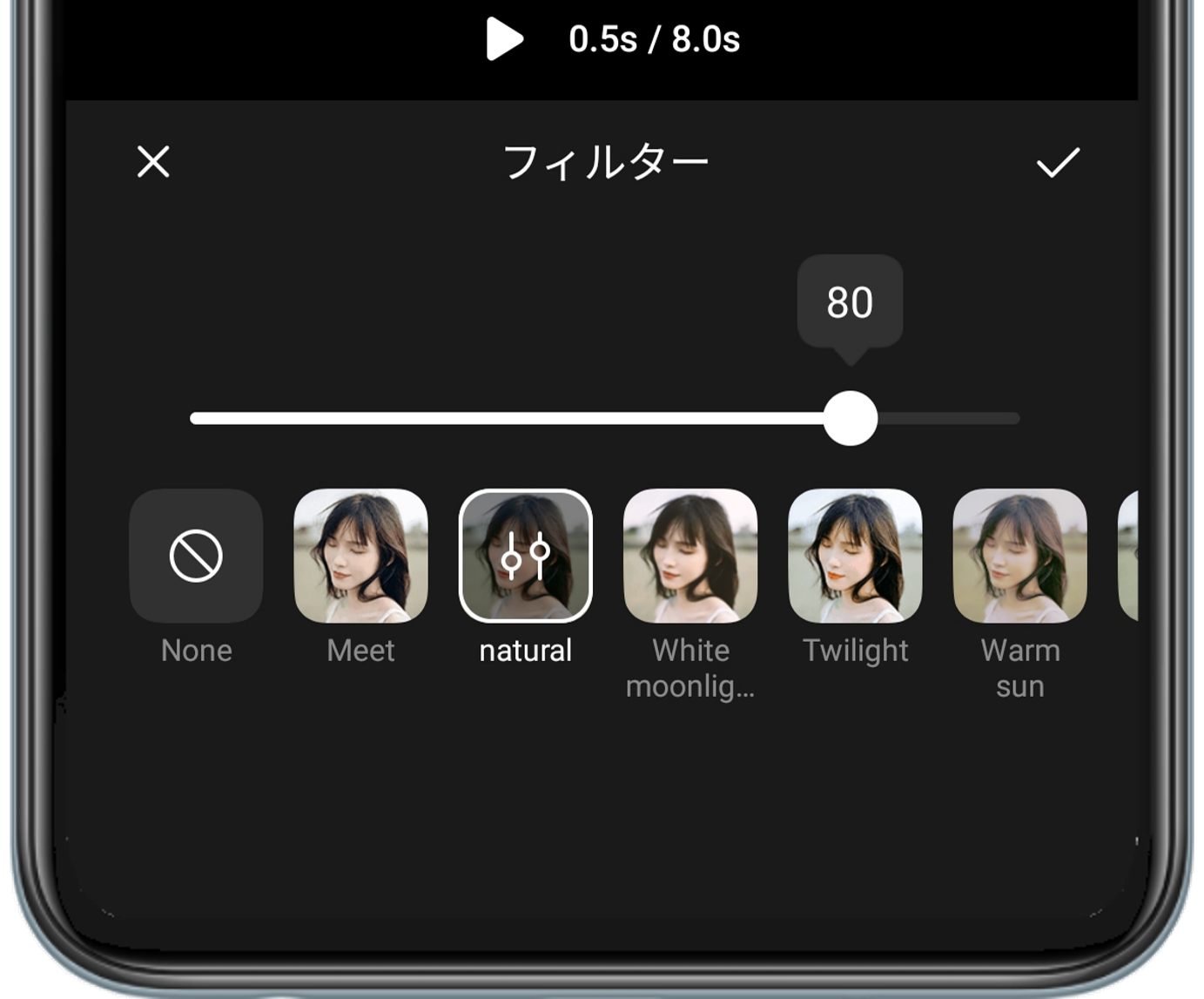 動画や写真の質感を良くするために、フィルターを追加します。「フィルター」をタップして、動画に合わせて選択します。10種類以上のフィルターが用意されています。選んだ後、もう一度フィルターをタップして強さを調整します。