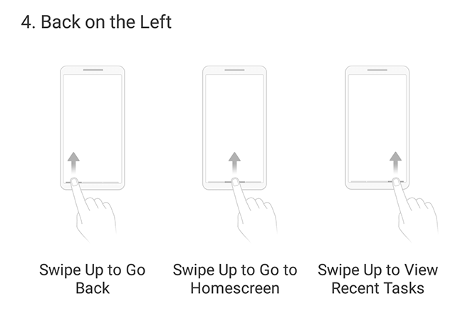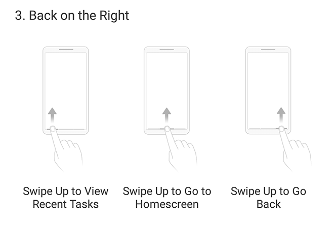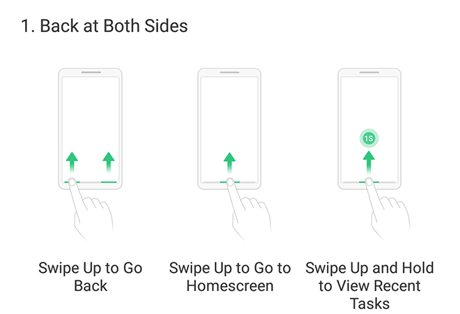 Swipe up from the left bottom to view recent tasks, swipe up from the middle bottom to get to the Home screen, and swipe up from the right bottom to return to the upper page.
