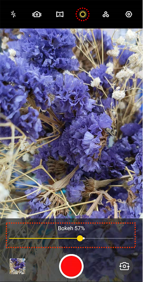 To add blur effect, tap the Camera app, select the VIDEO on the lower part of the screen, then tap the Bokeh/Portrait Blur icon at the top of the screen. Once turned on, you can adjust the blur by sliding the lower progress bar.