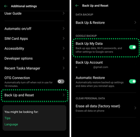Go to [Settings] > [Additional Settings] > [Backup & Reset] > Enable [Backup my Data].