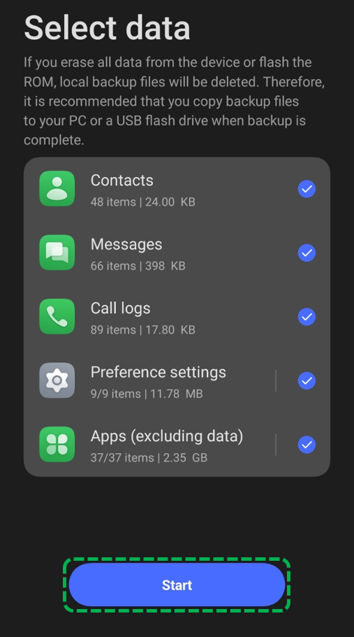 Go to [Settings] > Click on [System & updates] > Click on [Back up & reset] > Tap on [Back up & migrate] > Click on [Local backup] > Click on [New backup] > Select all the required options > Tap on [Start].