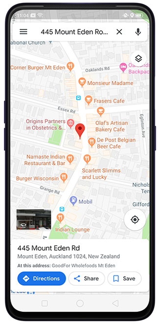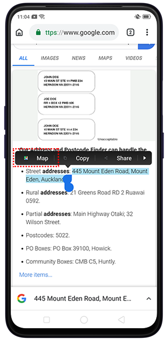 Navigate location: Select an address and tap Map to go directly to Google Maps and display the selected address.