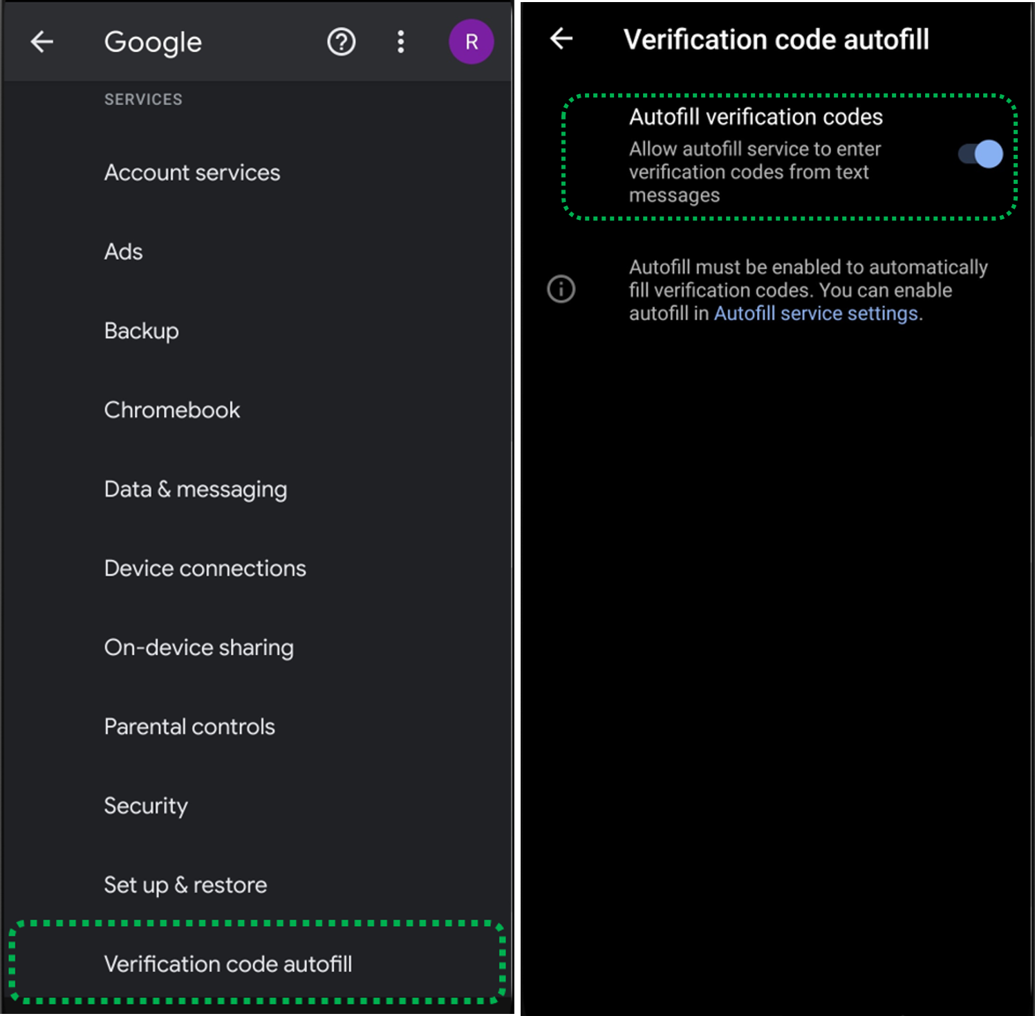 Go to [Settings] > [Google] > [Verification code auto-fill] > Enable [Auto-fill verification codes].