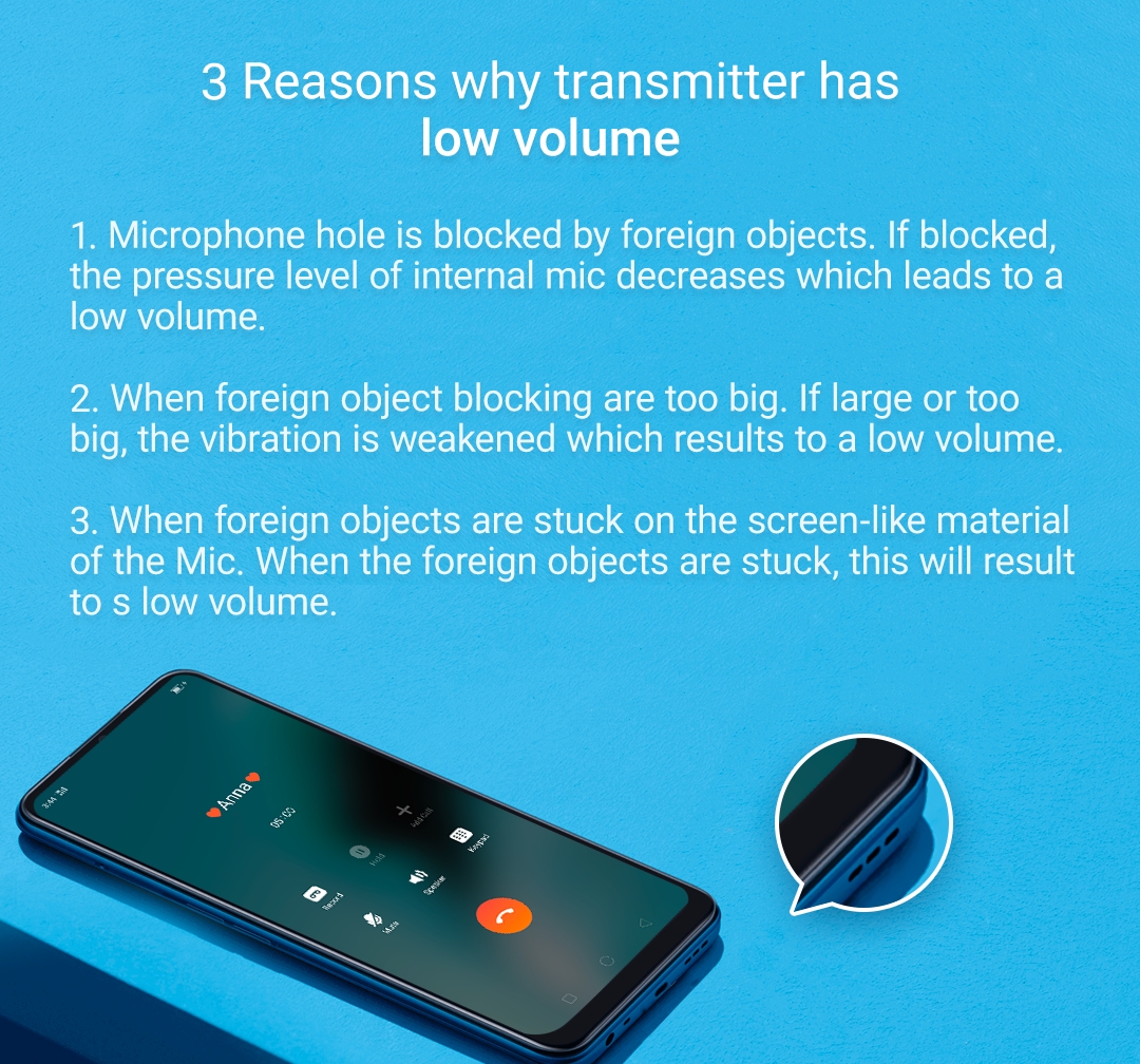 Situation: You want to know the reason why the transmitter of your phone has a low volume.