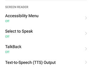 Screen Reader: Includes Accessibility Menu, TalkBack, Select to Speak, and Text-to-Speech Output.