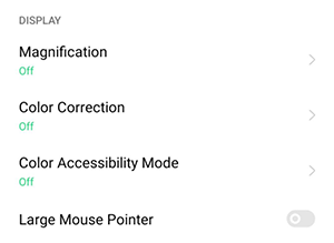 Display: Includes Magnification, Color Correction, Color Accessibility Mode, and Large Mouse Pointer.