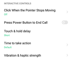 Interactive Controls: Includes Switch Access, Click When the Pointer Stops Moving, Press Power Button to End Call, Touch & Hold Delay, Time to take action, and Vibration & haptic strength.