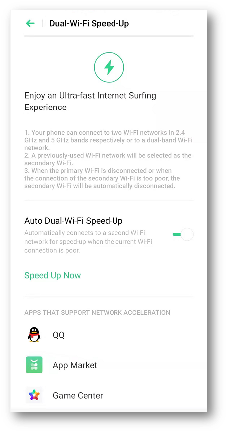 Manual toggle: [Settings] > [Wi-Fi] > [Smart Speed-Up] > [Dual-Wi-Fi Speed-Up] > [Auto Dual-Wi-Fi Speed-Up] > toggle to enable.