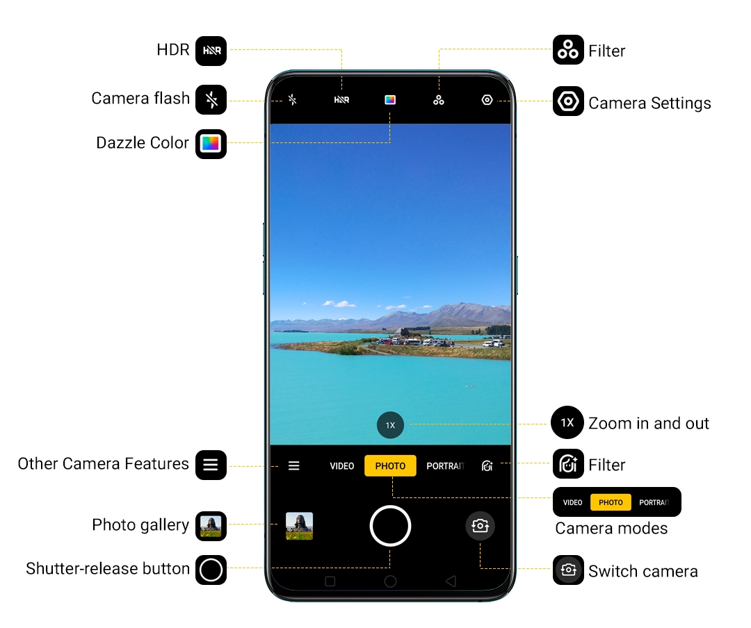 Note: Camera features vary per product and ColorOS version. Most features shown are available for the recent ColorOS versions and new phone models. Also symbols./icons might change but functions just the same.