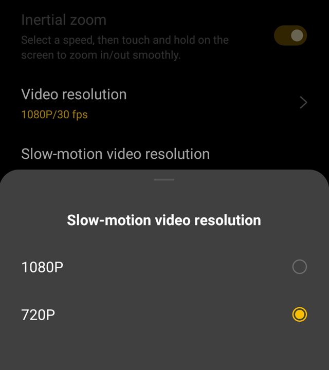 Currently, you can shoot slo-mo videos in 720p and 1080p resolution only. To change the resolution, go to [Camera] > [] > [Slow-motion video resolution] > [Select the resolution].
