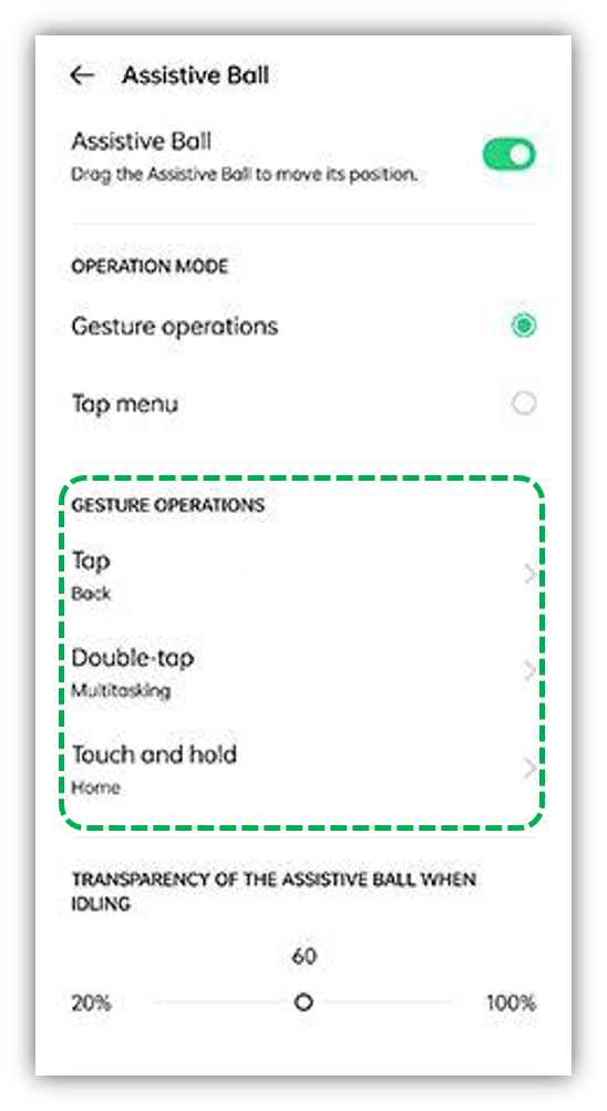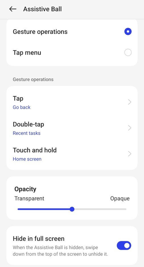 Go to [Settings] > [Convenience tools] >[Assistive Ball] > Scroll down, then tap the gestures you want to change.