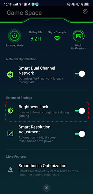 To enable Brightness Lock, on the home screen, open the [Game Space] app, slide up the Menu bar, and toggle on [Brightness Lock].
