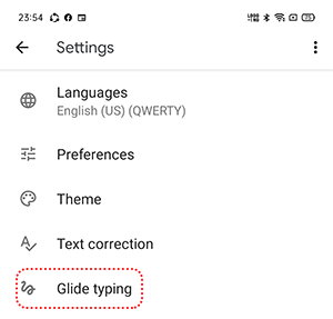 To enable Glide typing, on the keyboard, tap the Settings icon > [Glide typing] and toggle on [Enable glide typing]. Alternatively, on the home screen, tap [Settings] > [Additional Settings] > [Keyboard & Input Method] > [Gboard] > [Glide typing].