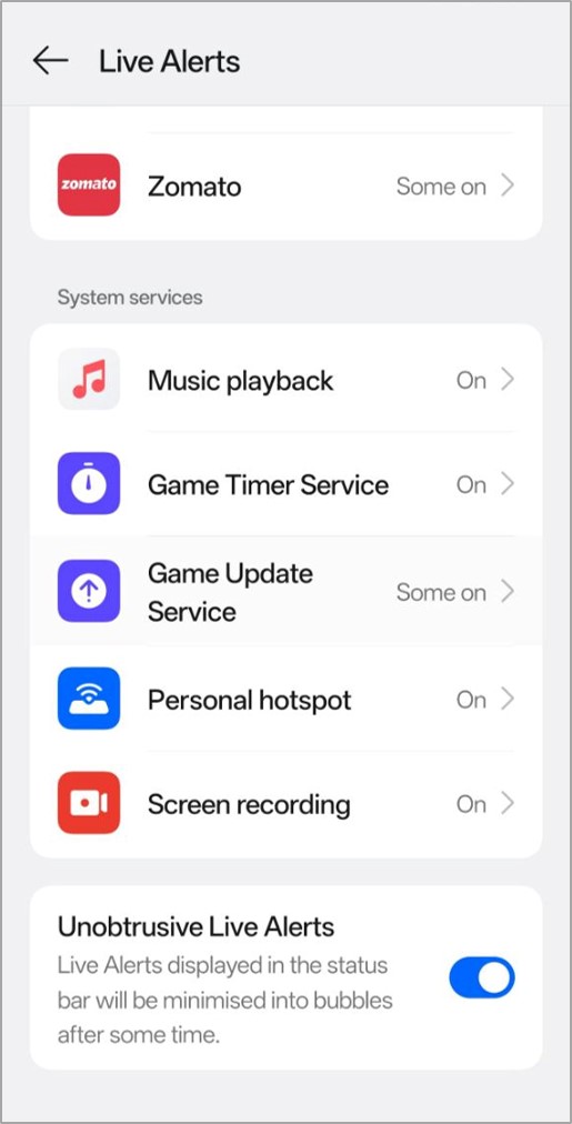 This feature is limited to some applications for both Third-party(Swiggy, Spotify, Zomato) and Pre-installed(Music Playback, Game Update Service, Personal Hotspotand Screen Recording).