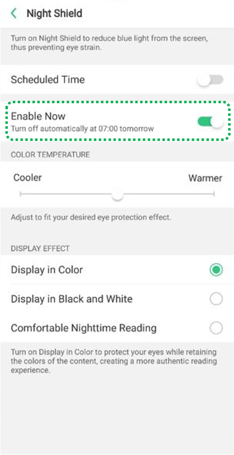 When Night Shield is in use, your phone automatically adjusts the display. This gives a warmer, less blue light effect, thus preventing eye strain.