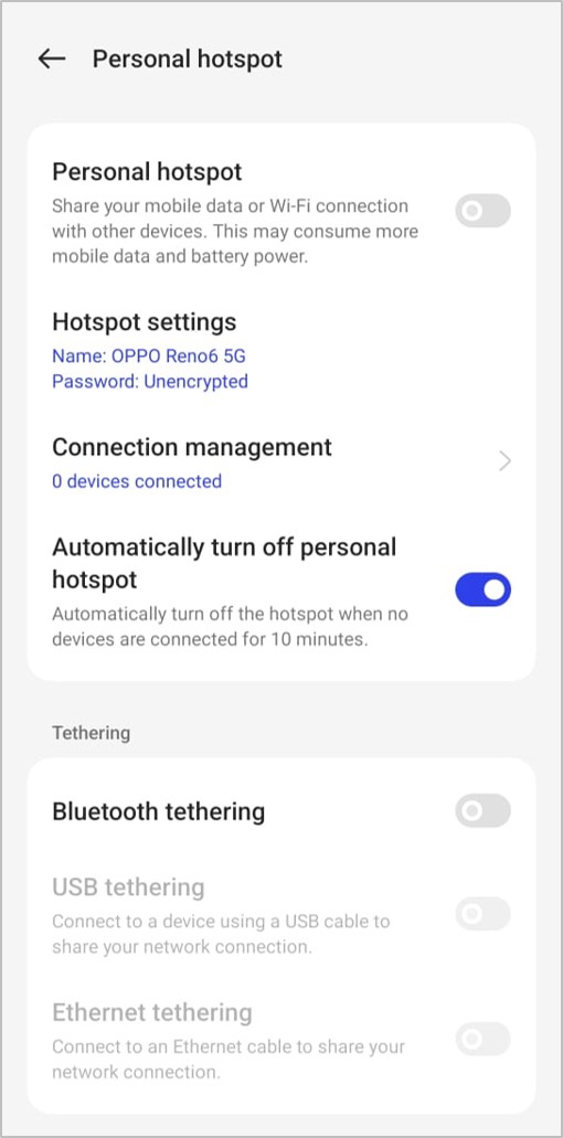 Note: When turned on, your Internet connection will be shared and more data and power may be consumed. This will automatically turn off after 10 minutes when no device is connected.