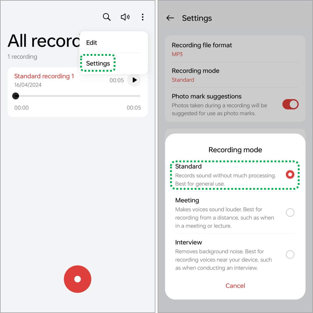 Interview mode: Applies a noise-cancelling algorithm. Best for occasions where the voice to be recorded is near your phone, such as for interviews.