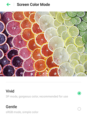 Screen Color Mode setting helps you to set the preferred tone for your phone display. It comes with two color modes, Vivid and Gentle.