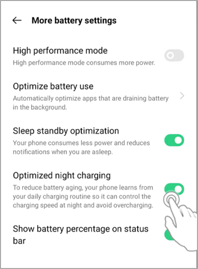 Optimized night charging, also referred to as AI night charging uses AI algorithms to learn your sleeping pattern such as when you sleep and when you wake up. It will take some days to learn your sleeping pattern. After that, it optimizes battery charge to reach 100% exactly at AI-determined morning wake time. Protects battery lifespan due to repeated charging between 80% and 100%.
