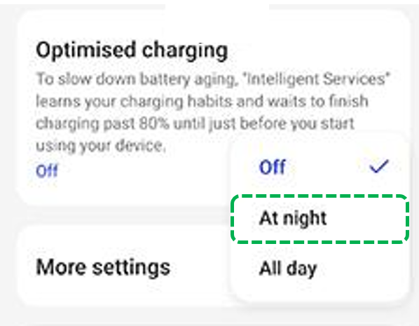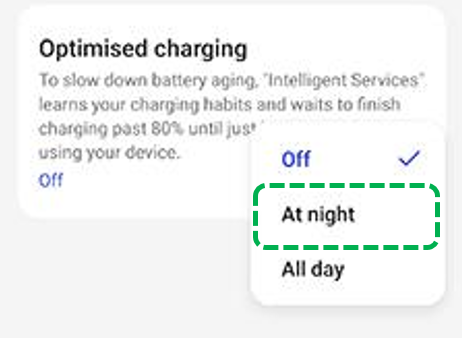 Devices with Battery Health engine: Go to [Settings] > [Battery] > [Battery health] > Select [Optimised charging/Smart charging] > Select [At night]