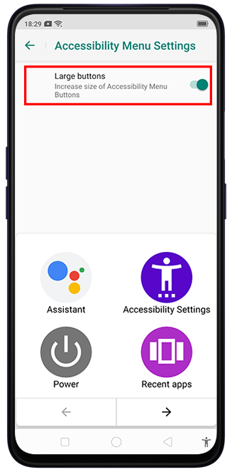 From the Accessibility Menu screen, tap [Settings] and enable [Large buttons].