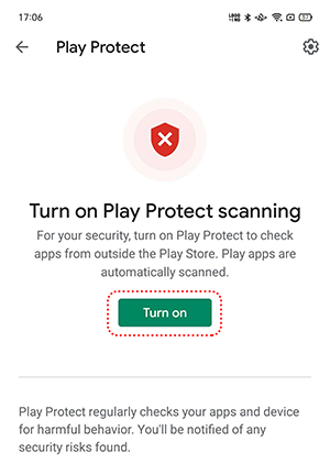 Open the device's [Settings] app > [Google] > [Security] > [Google Play Protect] and tap [Turn on] to allow Play Protect scan your apps.