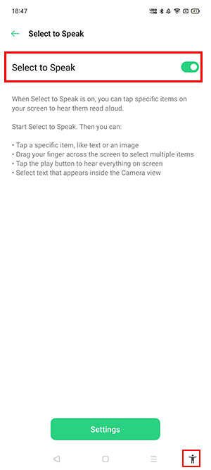 On your home screen, open [Settings] > [Additional Settings] > [Accessibility] > [Select to Speak]. Toggle on [Select to Speak] and tap [OK] to allow access.
