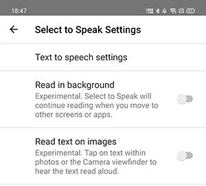 Open [Settings] > [Additional Settings] > [Accessibility] > [Select to Speak] and tap [Settings] at the bottom. You can set [Read in background] or [Read text on images] according to your needs.
