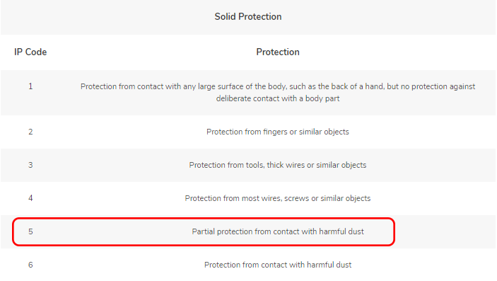 For the IP54 rating, the first digit '5' means the device is partially protected from "harmful" dust while the second digit '4' guarantees protection from water sprays and splashes in all direction.