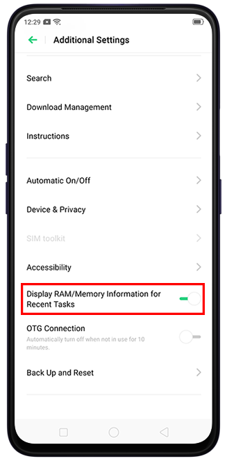 in Recent Tasks. To enable memory information, go to [Settings] > [Additional Settings] and toggle on [Display RAM/ Memory Information for Recent Tasks].