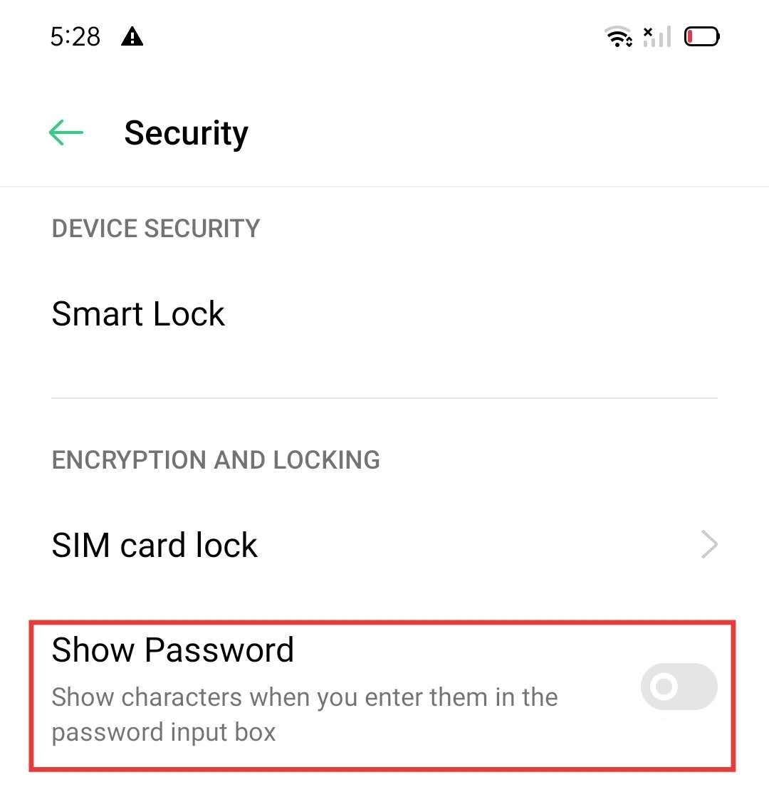 For ColorOS 6.1 and 6.0. Go to [Settings] > [Device & Privacy] > toggle off [Show Password]/[Show Passcode].