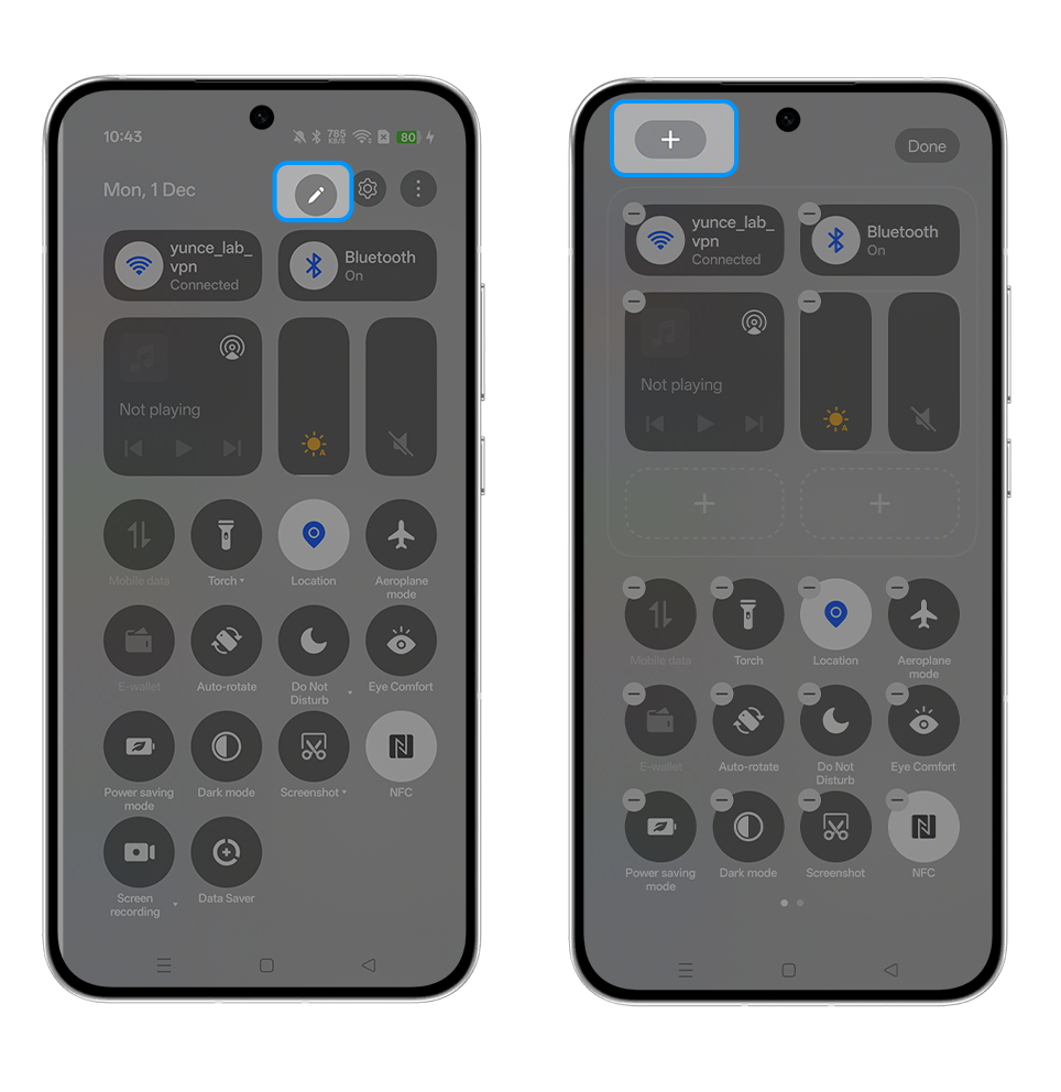 On certain devices, swipe down on your OPPO phone screen to reveal the Control Center > tap the [three-dot] icon in the top-right corner of the screen > [Edit] > set the icons you want to display or remove.