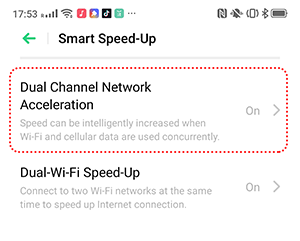 Enabling Smart Dual Channel Network optimizes Wi-Fi network latency by switching to a stronger and stable network. The Smart Dual Channel Network option will only be available if the device has Dual Channel Network Acceleration feature. Check if your phone has the Dual Channel Network Acceleration in [Settings] > [Wi-Fi] > [Smart Speed-Up] > [Dual Channel Network Acceleration]. The availability of this feature depends on the phone hardware.
